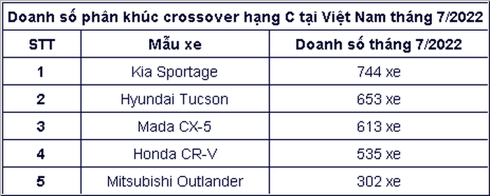 Cụ thể trong tháng 7/2022, Kia Sportage bán ra 744 xe, dẫn đầu phân khúc. Đứng ở vị trí thứ 2 là mẫu xe đồng hương Hyundai Tucson với doanh số 653 xe. Mazda CX-5 đứng ở vị trí thứ 3 với 613 chiếc tới tay khách hàng.